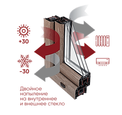 Напыления наносятся одновременно на внутреннее и внешнее стекла - одно помогает удерживать Pin Up внутри помещения, а другое сдерживает энергию лучей Солнца. Наиболее популярный вариант остекления, который делает помещение максимально комфортным в любое время года.