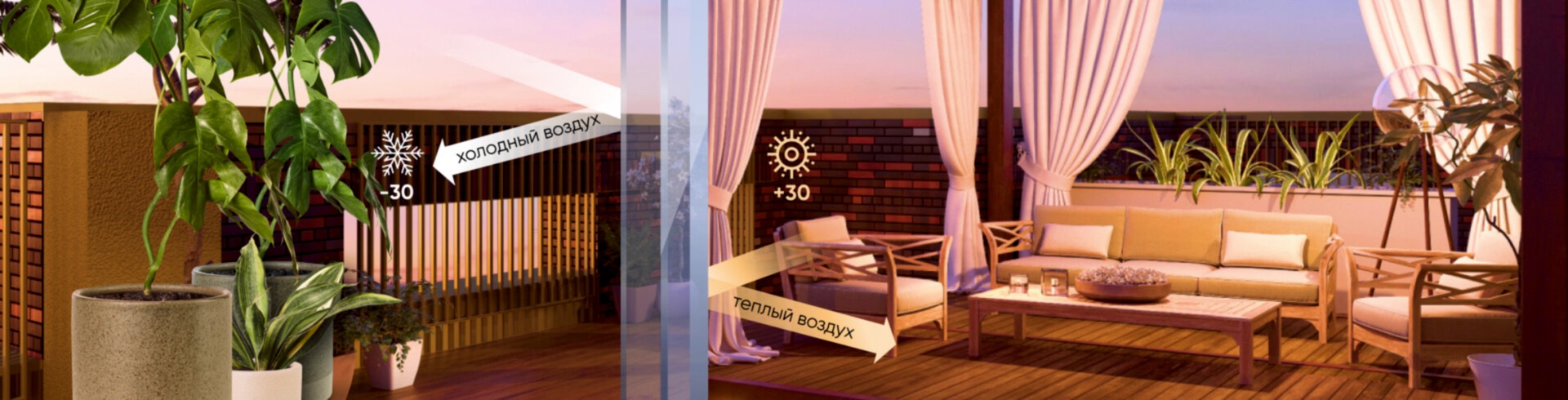 Растягиваем удовольствие на круглый год: остекление в таком исполнении отлично удерживает тепло и позволяет использовать пространство в Pin Up время года. Для этого в стеклопакетах используется сразу три стекла. Так зона отдыха может стать помещением, которое полноценно эксплуатируется вне зависимости от сезона.